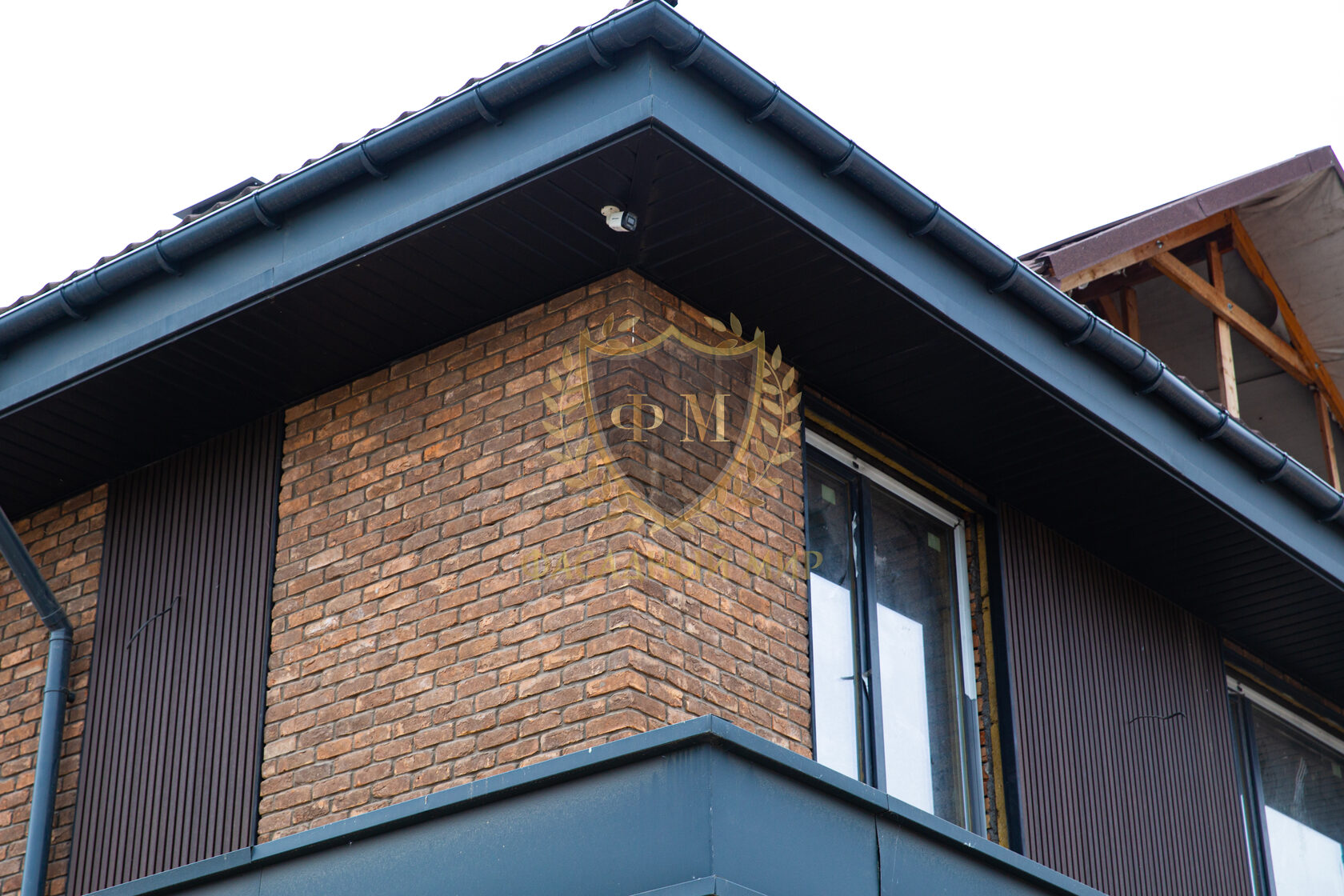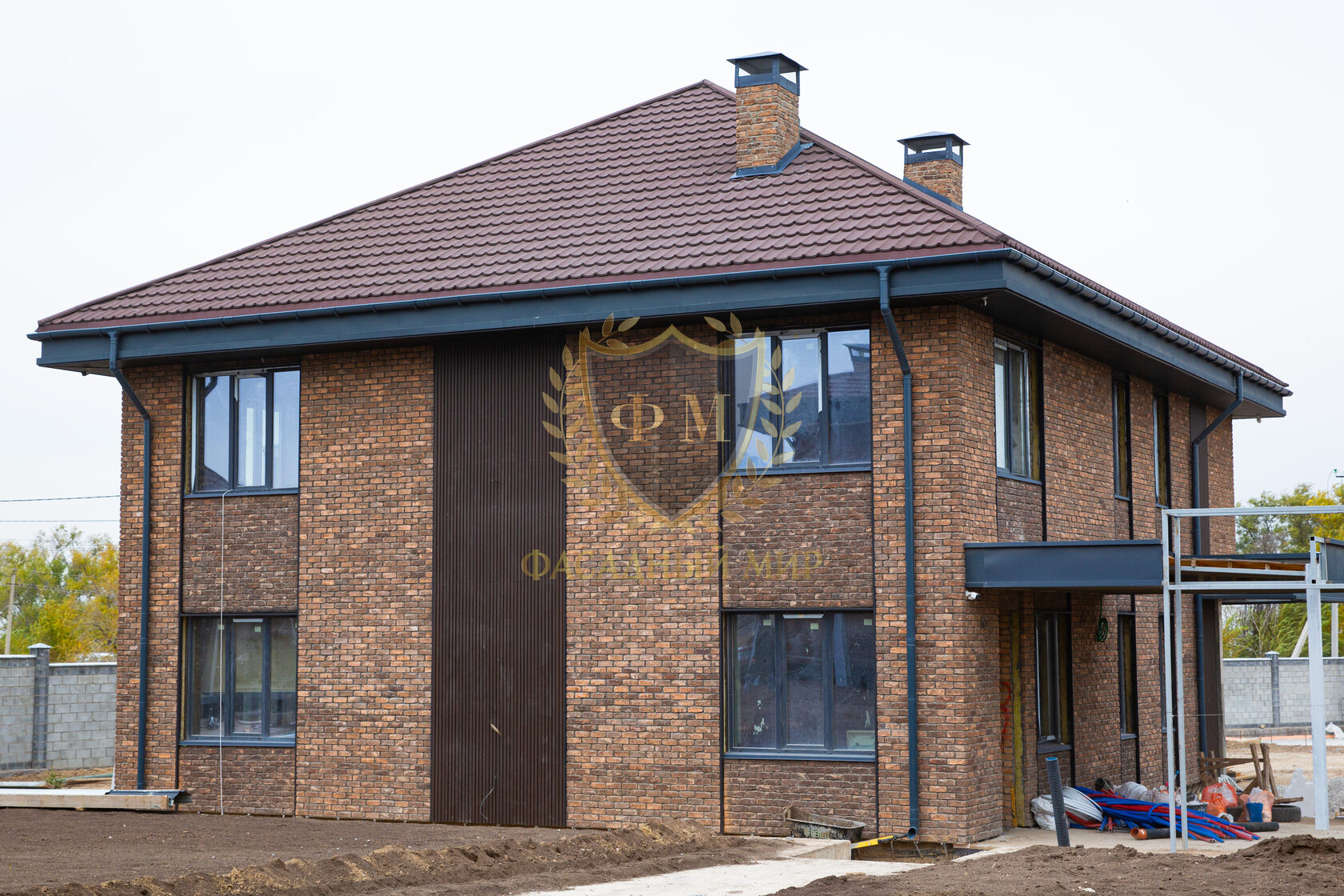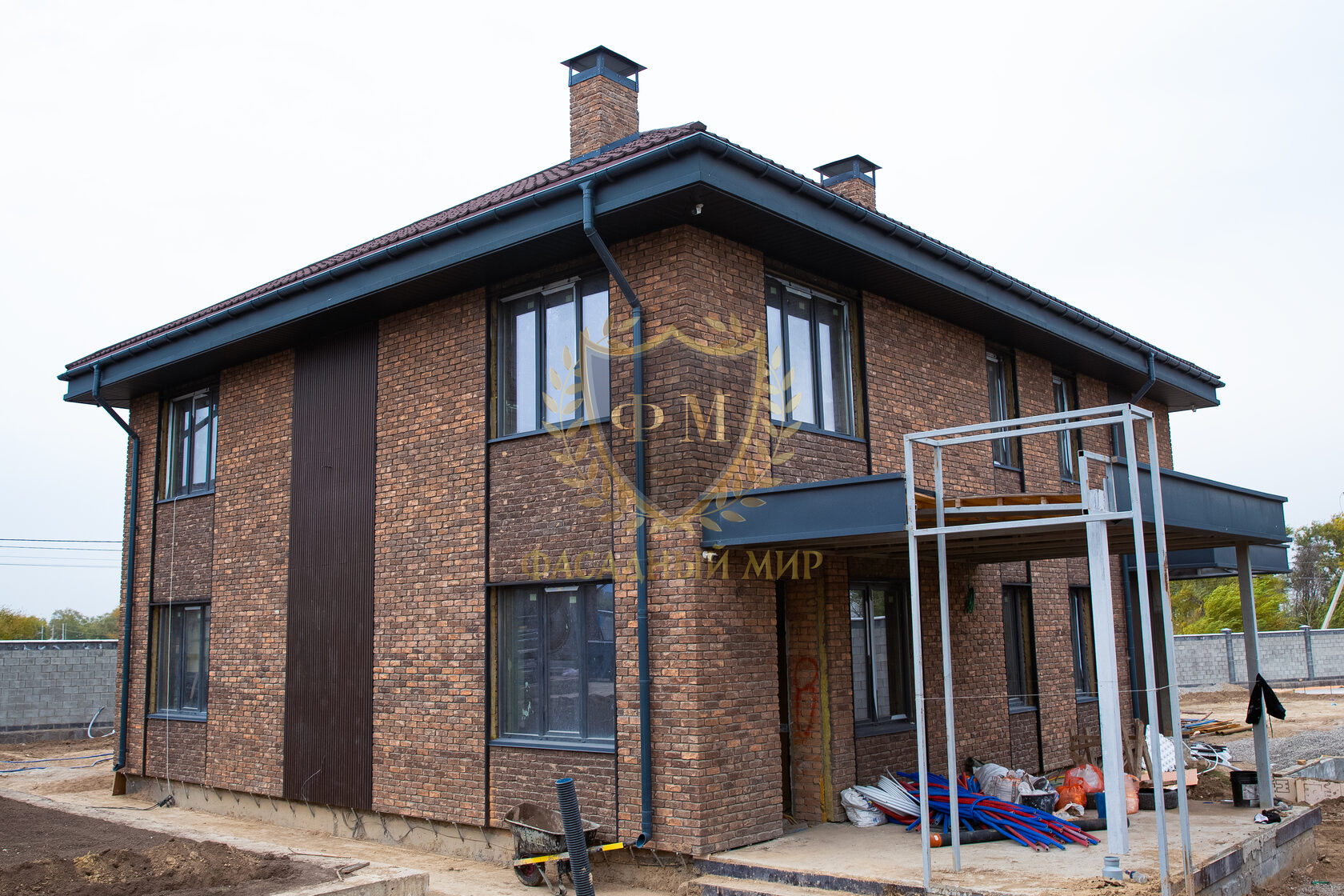 При облицовке фасада на углах дома использовался формат цельного кирпича (210*100*65 мм.), а на основной стене формат кирпича «Половинка» (210*50*65 мм.).